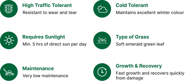Fortress Buffalo can withstand heavy wear and tear, making it an excellent choice for high-traffic areas. Its fast growth across the ground and quick recovery from damage ensure your lawn remains robust and attractive.