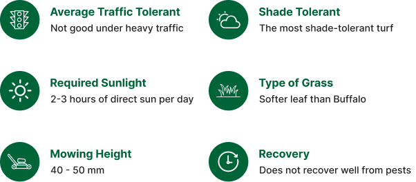 Sweet Smother isn't just a shade specialist; it's also well-equipped to handle everyday wear and tear. It's ideally suited for normal home lawns and thrives in the climate conditions of South East Queensland.